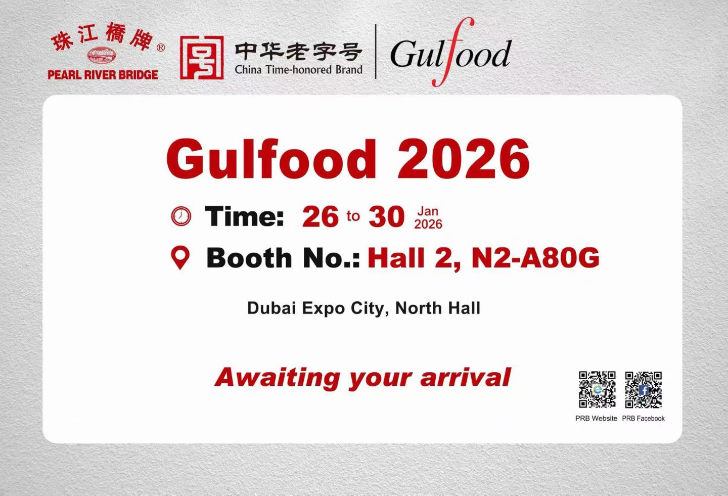 تحت شعار "في انتظار وصولكم"، تتطلع شركة جسر نهر اللؤلؤ إلى التفاعل مع الموزعين والطهاة وعشاق الطعام طوال أيام المعرض الخمسة. ويؤكد هذا الظهور التزام العلامة التجارية بالتوسع العالمي ودورها كسفير للنكهات الصينية التقليدية في قلب دبي.
